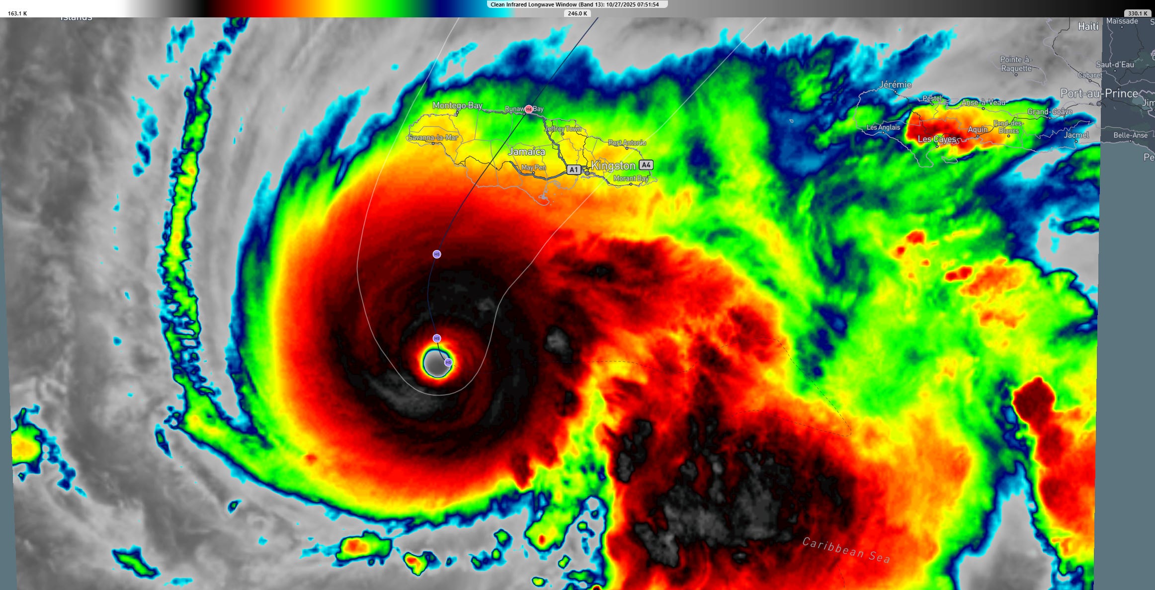 Both the visible (above) and infrared imagery (below) show evidence of a very intense hurricane, rated as a category 5 on the Saffir Simpson Hurricane Wind Scale, the highest rating on that scale. The intensity and slow movement of the storm, plus the track of the center directly over Jamaica suggest a long duration of extremely damaging winds and heavy rainfall/flooding for the island.