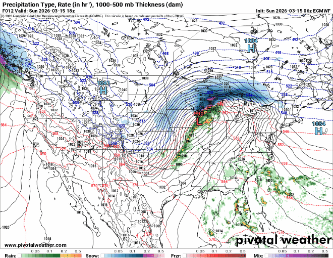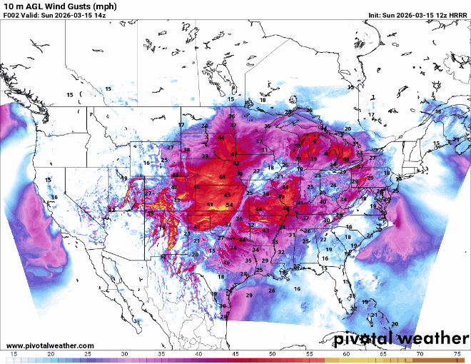 Finally note the forecast wind gusts from the same model run shown below. One can see the vast area with gusts in the 40 to 50+ mph range behind the frontal zone and around the cyclone.