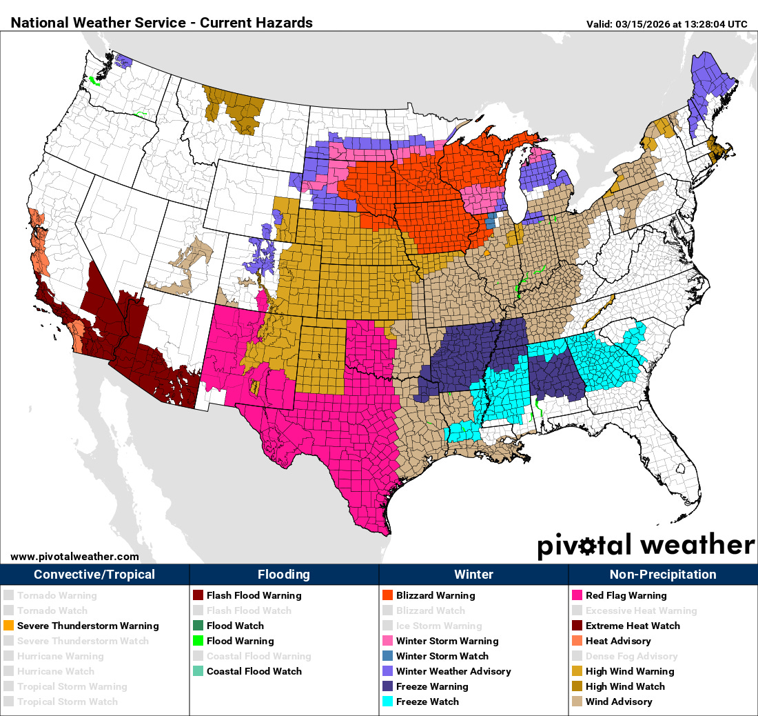 The latest watch/warning/advisory map from the National Weather Service is shown below. Note the extremes on the map with a very large Blizzard Warning shown in red over the Northern Tier, a variety of wind related highlights over the center of the country (High Wind Watches/Warnings and Wind Advisories), fire danger related headlines over much of Texas, Oklahoma and New Mexico (Red Flag Warnings), not to mention Extreme Heat Watches over the Southwest and Freeze Watches and Warnings over the Southeast!
