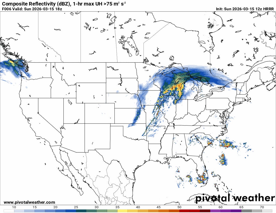 A loop on of the 12Z run of this HRRR this morning shows the general radar evolution starting around noon today and continuing through Monday evening. The line of storms with the front will likely contain fairly widespread damaging wind with the possibility of tornadoes both with the line and in cells out ahead of the line the next few days.