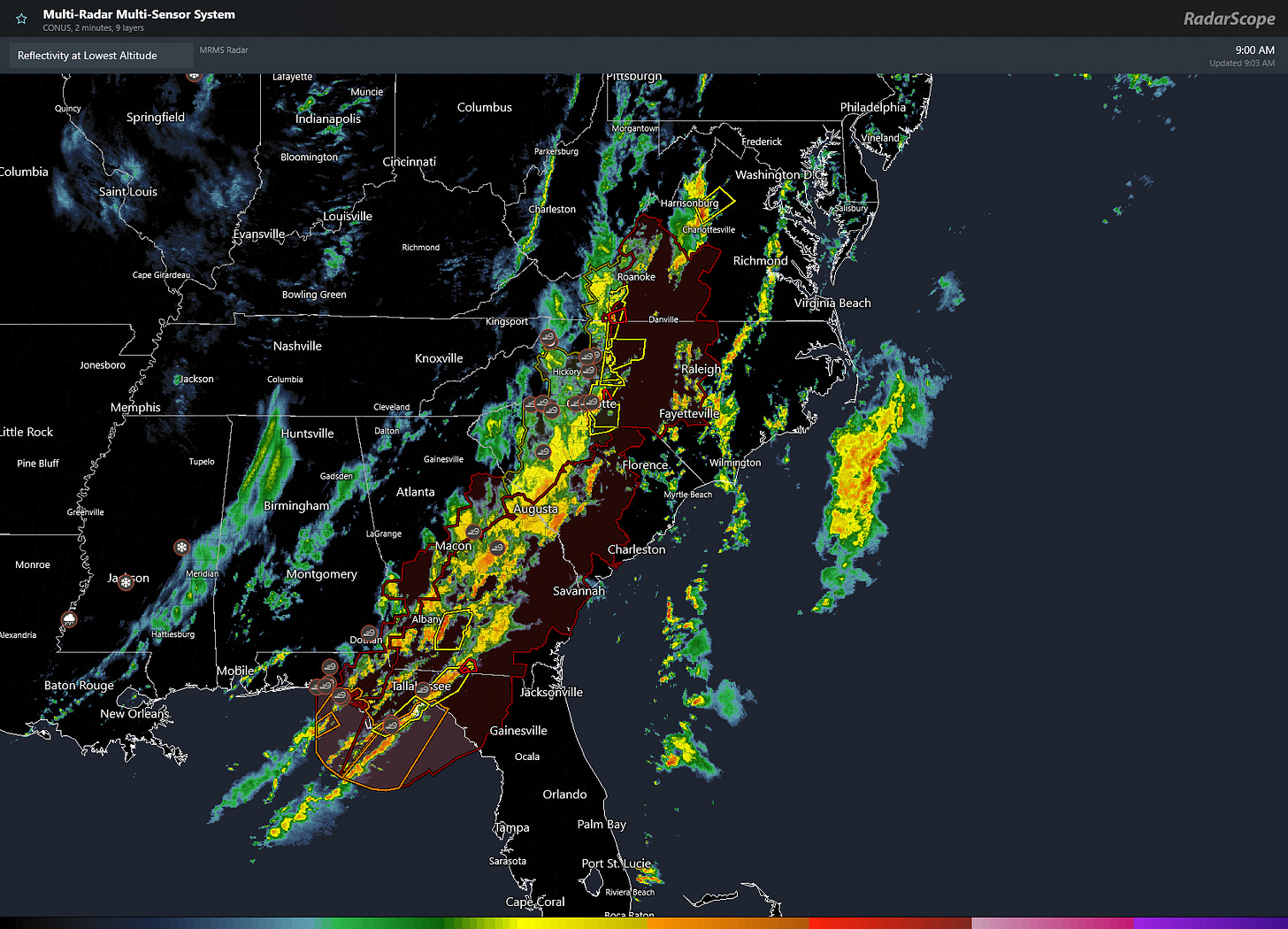 Conditions are in place for an outbreak of severe weather across the Southeast and Mid Atlantic today and this appears to be already underway. The image below is a map showing latest radar composite as of 10 am EDT Monday morning, also showing a tornado watch (in red shading) and various severe thunderstorm and tornado warnings (smaller yellow and red polygons respectively).