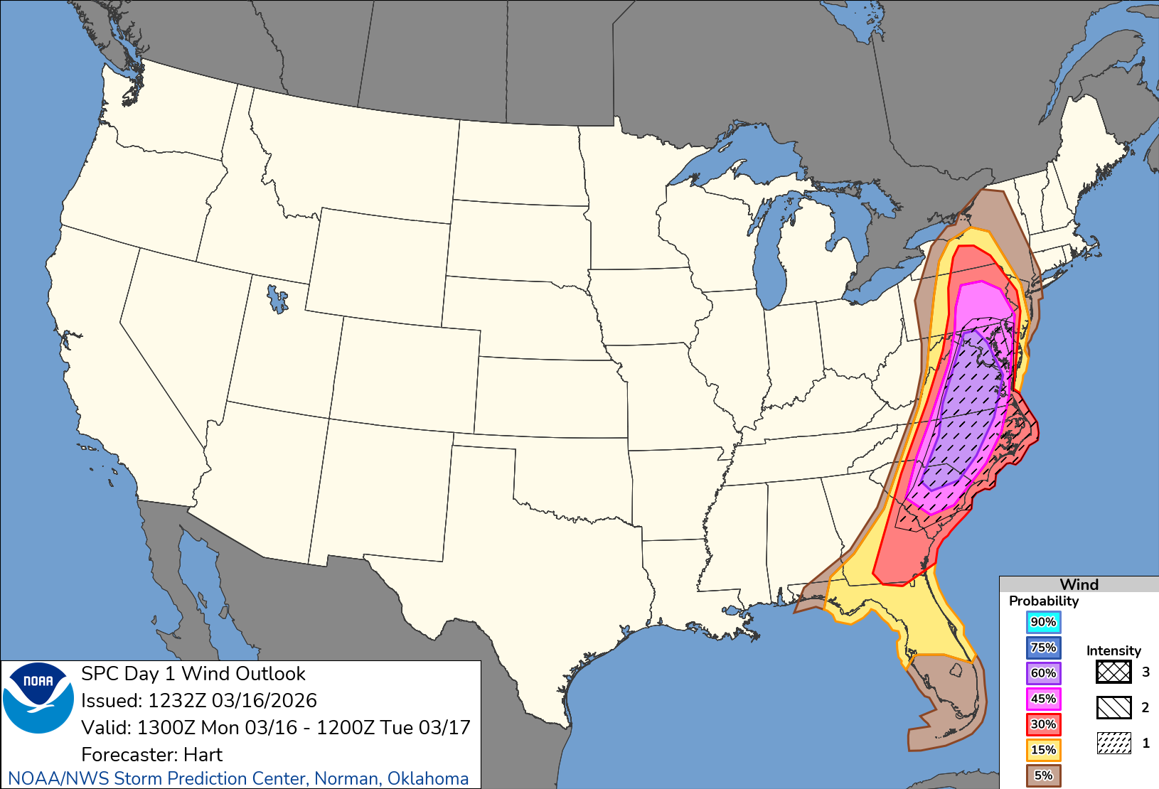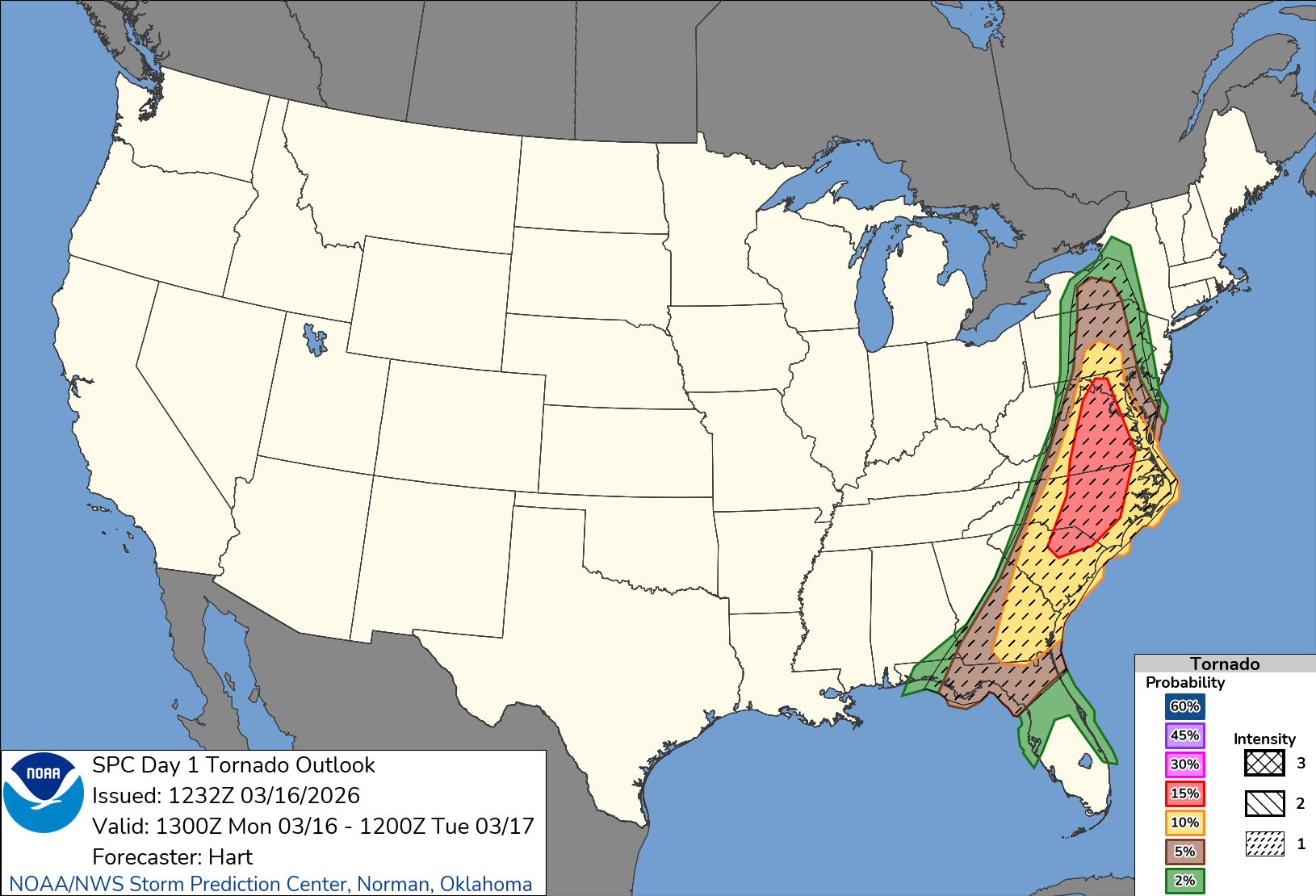 The hazard specific maps are shown below. Probabilities are defined as chances of a damaging winds/tornados within 25 miles of a point. The intensity hatching in this case suggests potential for 74+ mph winds and/or EF2 tornadoes.