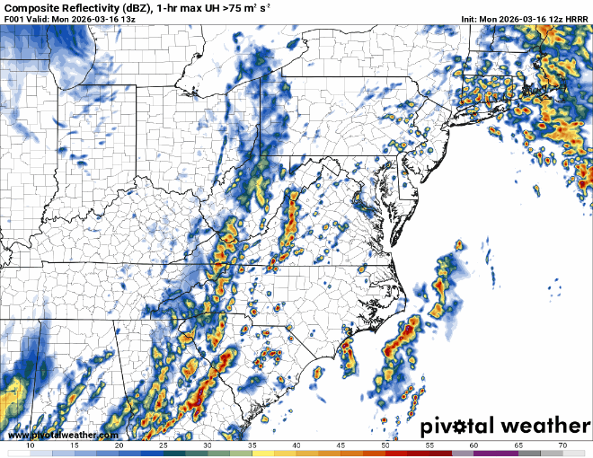 This mornings 12Z run of the HRRR model (shown from now to midnight tonight EDT) shows how the radar may evolve generally with lines of storms progressing east and northeastward from where they are now, with potential for cells developing out ahead of the main line. Damaging winds are a good bet. Potential also exists for development of tornadoes, especially in any discrete cells that develop out ahead of the line and/or with any circulations/mesocylones within the lines of storms.