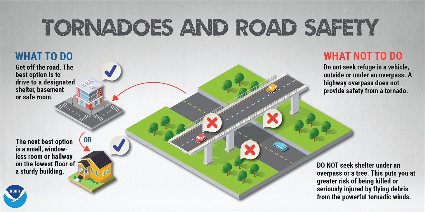 Stay tuned for updates, have multiple ways to get warnings. If a warning is issued for your area, take shelter. Its best not to be on the road during the warning, better to be inside a sturdy shelter. I’ve included a couple of reminder infographics from NOAA/NWS below.